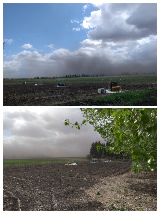 Little did I know that the 40 km/h winds we had at planting time were a practice run for today. 73 km/h according to the Weather Network. My little weather station only registered at 59 km/h, but regardless the wind sucks. I am glad I saw this coming and was prepared. However, I was pleasantly surprised at how much protection my big spruce trees provide and how far that protection reaches. Lots of dust in the air, but no casualties to report here.