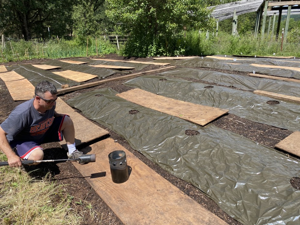 Prepping for planting tomato plants. I put down solar mulch and boards. Then measured for plants 4� and 7� apart. Then heated a briquettes chimney with a torch to quickly melt out holes where I measured.