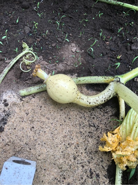 I didn�t want to come home to this. 1989 daletas is not doing what it should do. First pumpkin I pollinated at 23.5 ft is not growing and blossom is rotting. 8 days old. Second pumpkin is 4 days old and you can see it�s rotting and not growing. I don�t know why this is happening! Maybe weather related because when I pollinated those it was very hot and muggy. I�m getting a bit nervous. We have a 3rd pollination at 38 ft tomorrow. Yes folks. 38 ft. Main vine is 42 ft. I don�t know why it�s growing that fast. Keep your fingers crossed that this one does something! I need some luck.