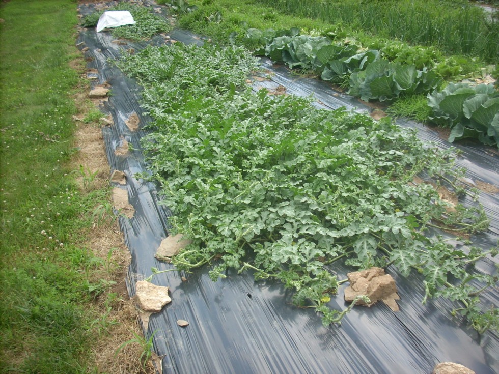 This shot is looking over my row of melons. There are three plants in this picture, plant's are about 27' long by 7' wide. Last year I produced a lot of seed. I harvested seeds from my four biggest melons. The germination was very poor on all but one of them. The seeds all look very viable with filled out cotyledons. I am not sure what happened. The only seed that would germinate reliably for me was from the melon I named "D1", 2 of my three JBD x CC melons are off that seed and and they are on 'Tetsukabuto' rootstocks. The other melon is on a seed that I will have to call "unknown" because I lost the label. However, I know for sure that it is off of one of my CC X JBD melon's from last year, I am just not sure which one. This last melon is on a 263 Ciesielski BG rootstock.