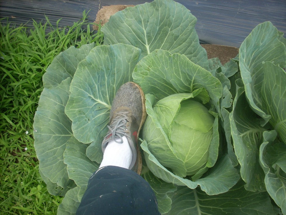 'Megaton' cabbage. Hands down the best cabbage to grow for size and vigor. It is just tougher than all the rest and for some reason the flea beetles don't mess with it as much as the other types. It can get big too. Here it is pictured next to a size 11.5 nike for size reference. It can get a lot bigger than this and it will stand up to the humid summer weather very well.