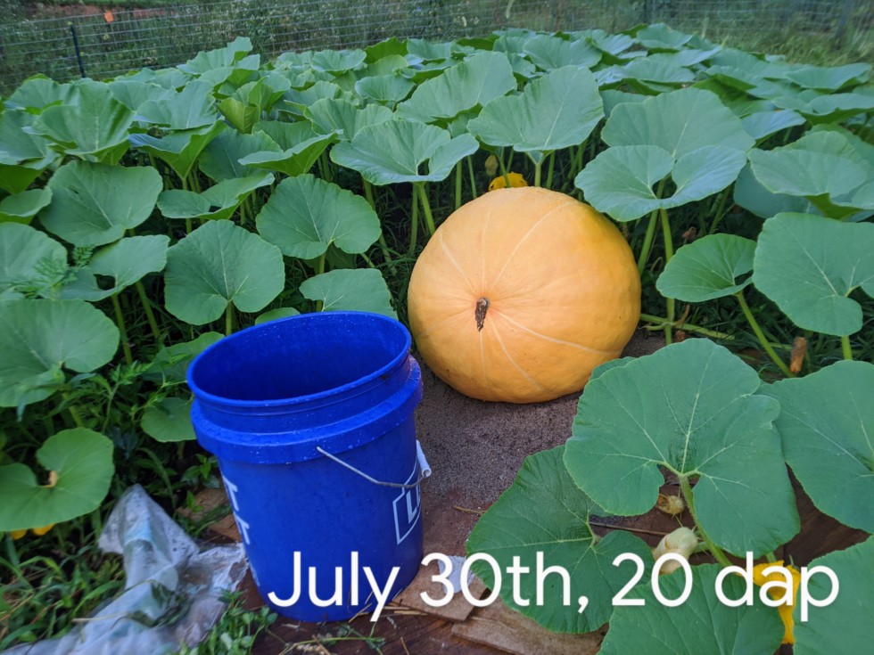 Officially 20 dap, 140 Ott, 56 in cir yesterday, seems to imply a 70ish lb pumpkin. We've got a 4 day camping trip next week, it'll be interesting to see what we come back to!