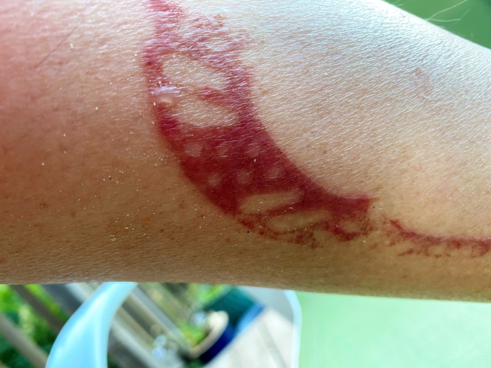 Permanently branded with my rear mountain bike disc brake pattern. Last week I crashed while going downhill. Upside down in a pile of logs, I feel this searing pain on my calf. Thought the gears had sliced into my leg. Hours later I see this and it hasn't changed. A week later it hasn't changed. Fine with me.
