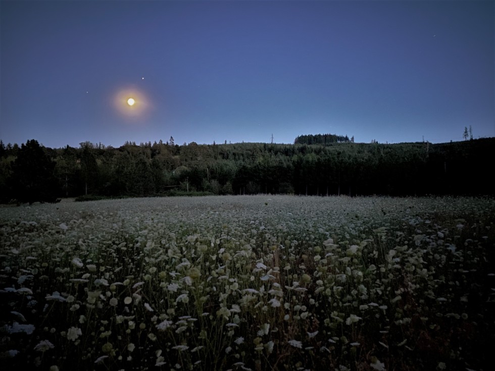 Every summer our field is ablaze with queen Anne's lace or wild carrot. A western weed if you will. In a couple of days it will be a full moon. Around midnight on the full moon it is super bright and pretty cool to walk around in. Then soon after I mow it all down before it becomes too much of a fire hazard.