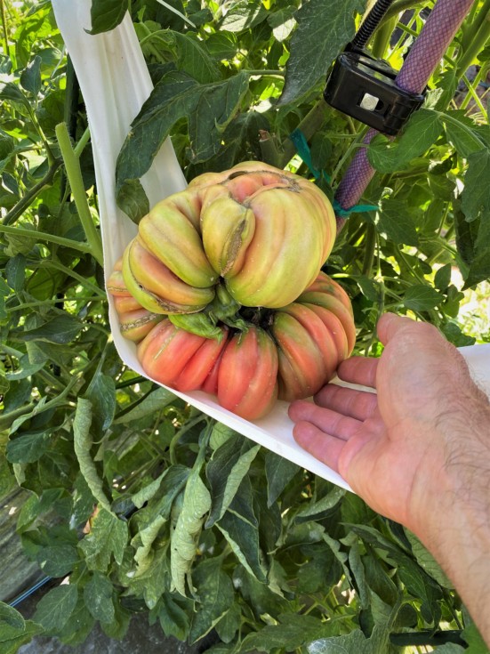 Rookie mistake alert! Five days ago I made a change on my watering system to increase watering times. Well, I didn't push start. So my entire tomato garden wasn't watered for 5 days. Several tomatoes prematurely turned red including this one. So I pushed start. Hopefully, I don't blow up the rest. So much for consistent watering. It's the 5.74 LaRue at 24.50" and 40 dap. Usually I can squeeze out 10 more days. I'll weigh it for GPC and get on the board. Hope to get 5 lbs.