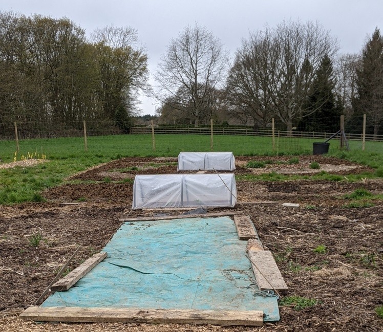 Got the mini greenhouses out to started warming up the soil. The big green tarp is supposed to exclude light and kill off any weeds.