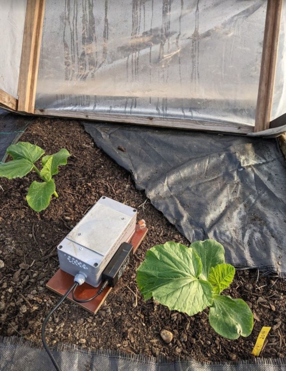 After 10 consecutive days of frost, we finally had a frost free night. This little heater (100W bulb in a box) keeps it just about 40 degrees in the mini greenhouse. The black fabric also helps to warm the soil during the day.