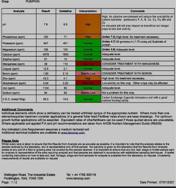 Phosphorus was too high - Ammonium Sulphate will be used for the next couple of years, rather than manure.Hopefully, the plants will take some up and reduce levels for next year.