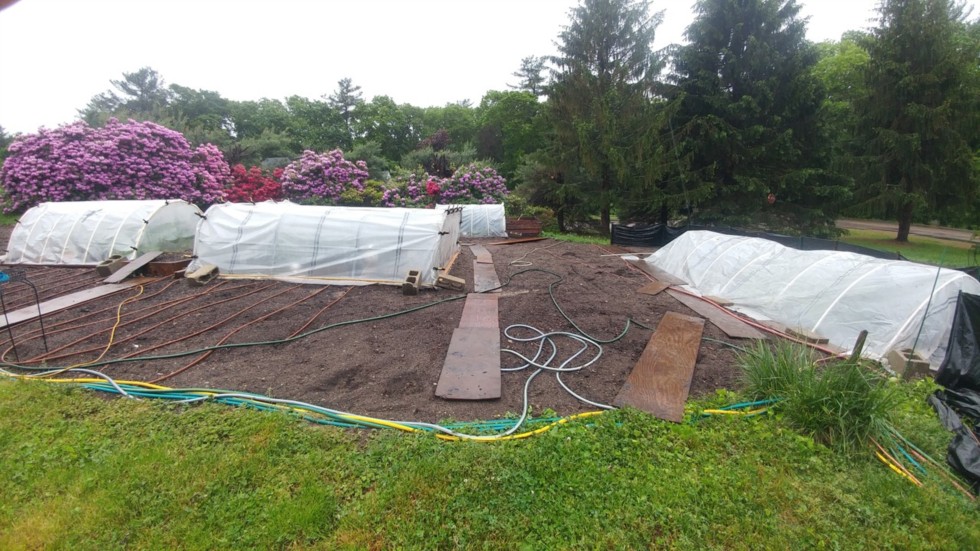 This weather is crazy. Last 4 days were in the 80-90F range. Now we are in a 3 day stretch in the 40's (day and night). I had to put the plant for the 150 contest (shown on the right) back into a 20 ft long poly tunnel with heaters. The 2593.7 Paton and the 2552 Mendi plants were never removed from their greenhouses because they hadn't out grown their 10ft long and 12 ft heated shelters. but they should be busting through tomorrow. 470 Bushel Gourd is in the greenhouse in the background.