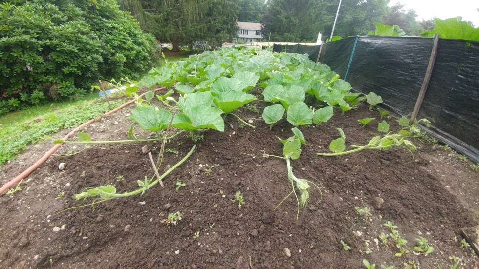The 470 Bushel Gourd plant looks like it has a few potential fruit at 22 ft out on a side vine. Some are visible on the left side of the photo
