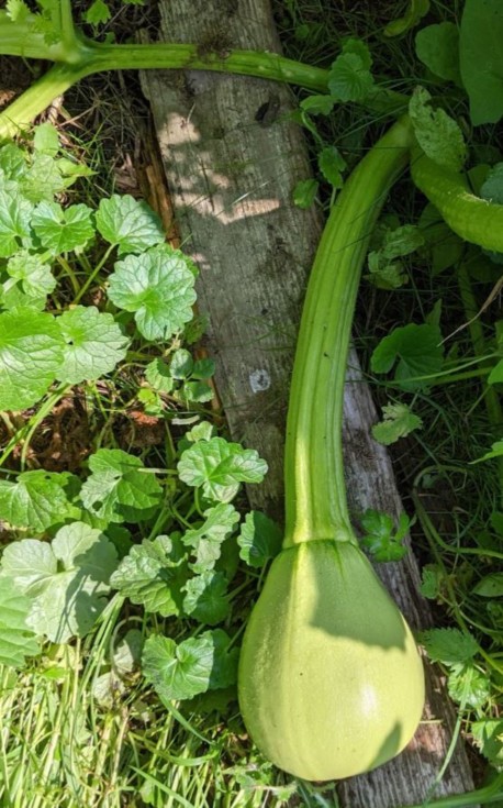 Some of my field pumpkins have gone a bit wild and spilled over into the weeds. This one has a super long stem. I will have to cull some of them.
