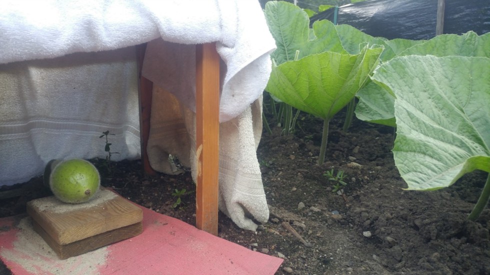 The Bushel Gourd was pollinated on 7/15 and looks like its set. 21 ft out on a side vine.