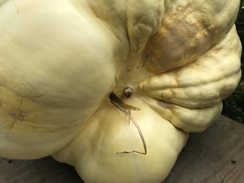 The 2045 pumpkin split. Not surprising. A result of too much rain and a structurally weak blossom end. Time to clean out the plant and seed a cover crop. Thanks for the seed Dan.