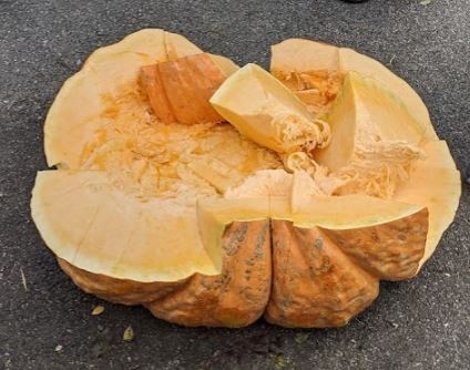 The final weight (6 and a half weeks since we picked it) was 523 lbs. (estimated weight of 507 lbs.) Not bad for absolutely no care. We cut it up and made some of it into soup. The pub also wanted a bit of the flesh although I'm not sure if they served it to customers. Cross was 265 Hochstetler x 2014 Paton. I will absolutely grow this seed... someday.