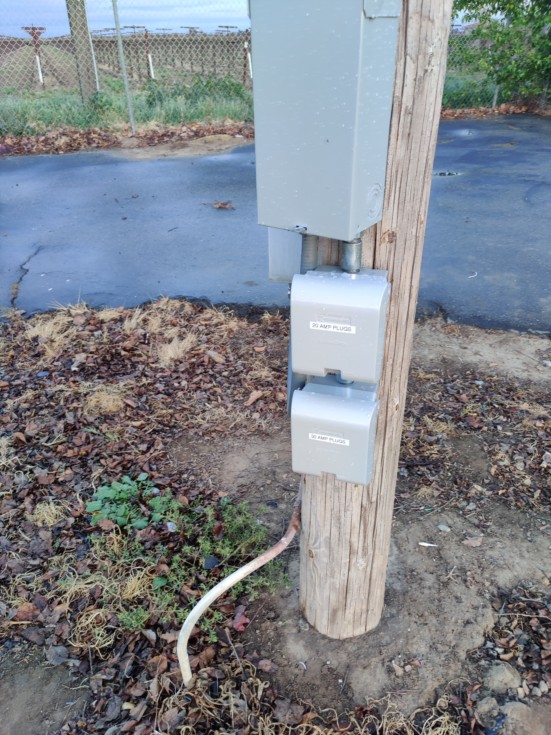 Electrician family friend Zach tapped into this service at the corner of my garden and got me some power. This pole is 3 phase 70 amps for one of our wells, but we removed the old pump and are going to put in a new one sometime soon. In the meantime, he gave me 100 amps across 4 breakers and 8 outlets, which is more than I'll need. I'll easily be able to run 2 1500 watt heaters and several grow lights. Might even up it to 4 heaters.