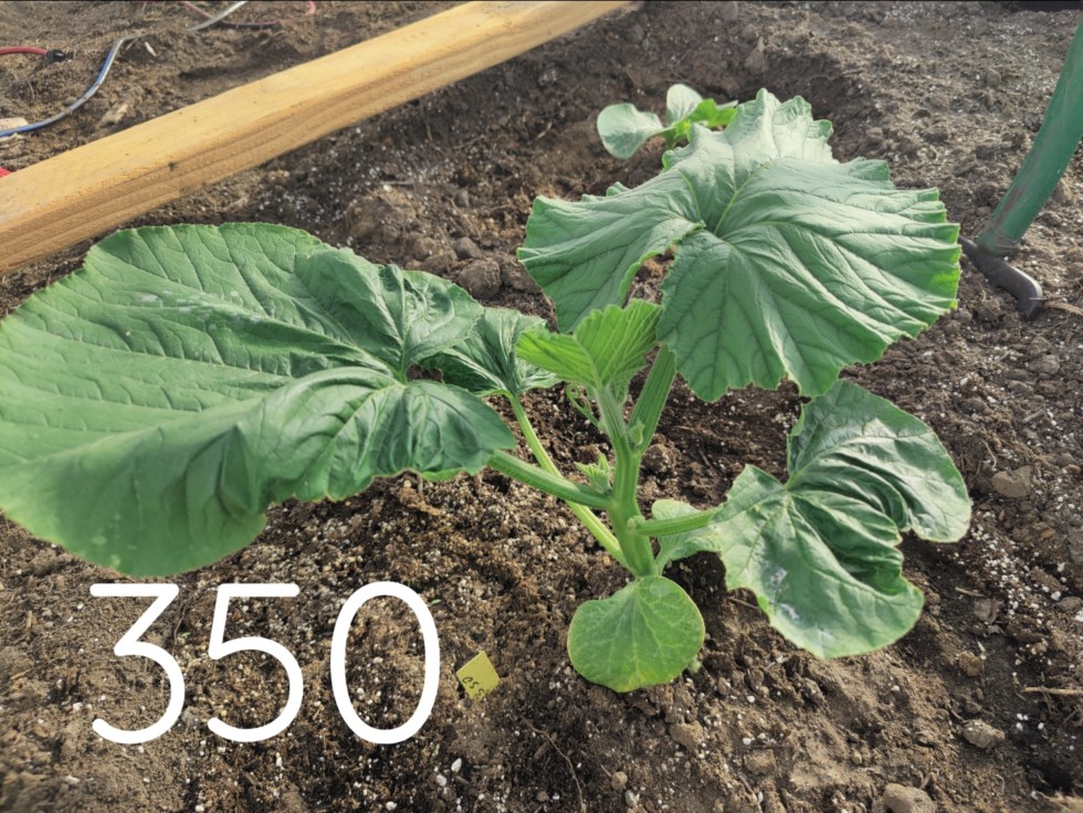 350 est Beattie (2009 wallace x self) 2014. I grew it for seeds after the main pumpkin collapsed on itself (the nutrients in the soil were pretty poor, almost no calcium) like the 1661, it has also produced strong seedlings for me, though they are intended as back ups.