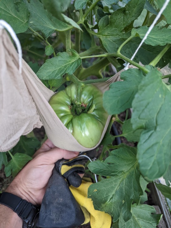 This is the big single on the Dan S. plant. I decided to start measuring it just for fun. I figured it was growing fast as I could see how much bigger it got each day. Yesterday (7-16) it was 11 1/2". Today (7-17) it is 13". So 1 1/2" growth a day. I also measured the old man megabloom tomato to the strickler plant. It is about 4-5 days younger than the single and started out much smaller it is 13" today. It has almost caught up with the big single. The 2 megabloom that I diligently hand polinated for several days are starting to show signs of early tomato so we will see.