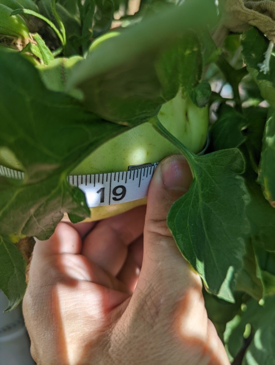 The old man tomato is 19 1/4". I'll measure it tomorrow and see if it's growing at all. It's days are numbered tho since one of the lobes is turning red.