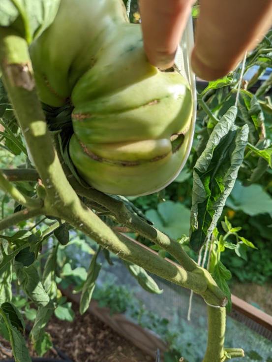 The Lyons slow growing tomato is still growing slowly. It might be blushing. I'll know in a day or so. Last time I measured it was around 19+". It is a very neglected tomato. It was one of the big twin megablooms (one on the Dan S. And one on the Lyons) The Dan S one took off and became the 3.88 Luers. I thought this one had not polinated but a few weeks later it started to grow. SLOW...... It also decided to grow upside down. If it could wear makeup it would probably be all black goth like and die it hair black and wear spikes hiding in it's room depressed listening to heavy metal and punk. Ya it's THAT tomato.