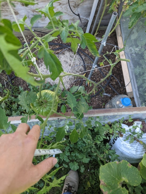 The two singles growing on the front clone main box (back clone has the smiling heart) is now one tomato. I culled the right one and branch. The tomato is growing fast and has almost caught up with the others already but we are running out of time. :/