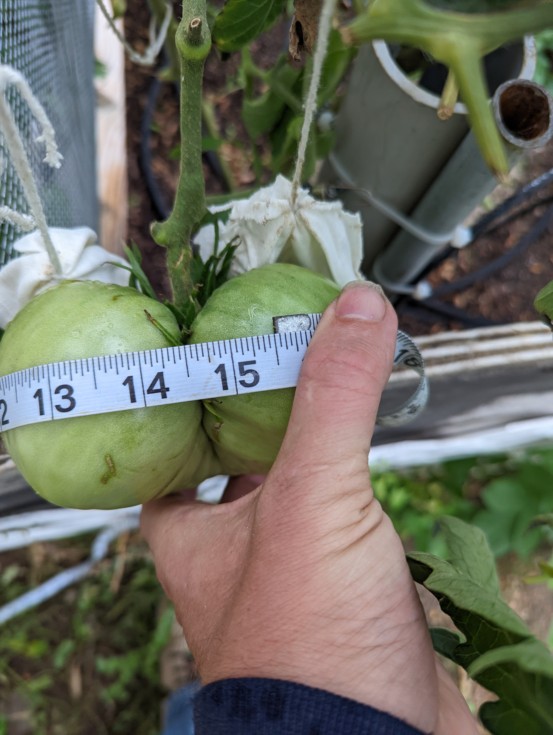 How about the Smiling Heart tomato. Its fun.... feels pretty heavy for only being 15ish inches. It is the slowest growing and by far oldest of the tomatoes. DAP 45. I really don't want to cut any of them off till they blush....ugh
