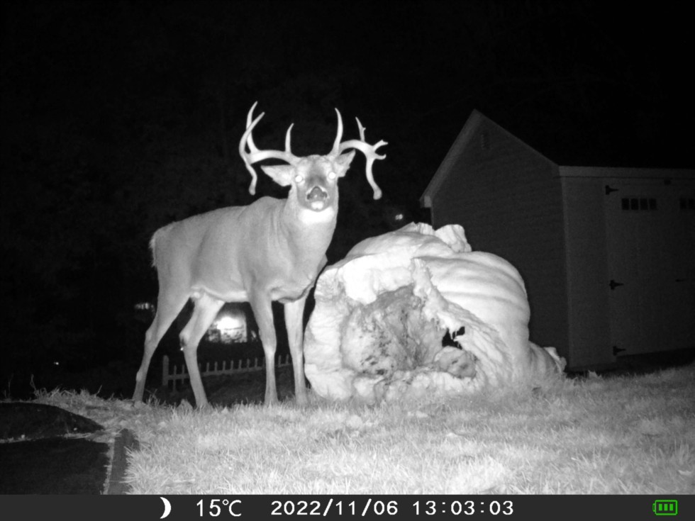 Deer eating the 1464 Gardiner. The buck is eating the pumpkin. Like they say everybody loves pumpkin.