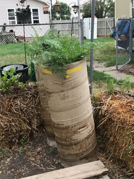 Also a first attempt is a try at long carrots. The tubes were first filled with sand, then a 3 inch hole was bored down to the bottom using a PVC pipe. I back filled the hole with good quality potting mix and planted on top of the now soil filled holes. My outside tubes are 12 inches across, and I bored 4 holes in each tube, so 4 carrots per tube. After they got going good, I pushed a 1/2 inch pipe down into the center of the tube about half way down, then removed the sand and reinserted the pipe. I now put a funnel on top of the pipe and water down the pipe to get the roots pushing for the lower moisture. Interesting and fun. Fingers crossed for 3 footers.