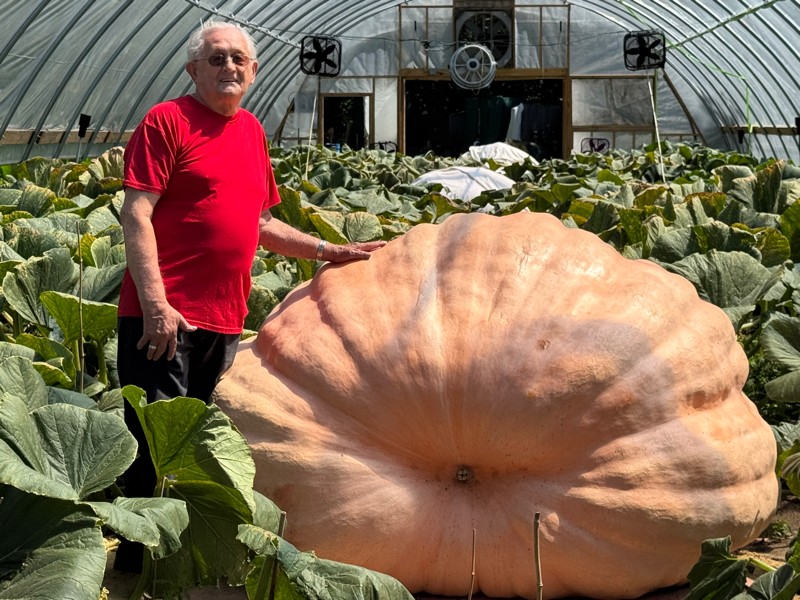 Gene's Dad stopped over to see the pumpkins today. Here he is with Gene's bigger 2198 Sperry pumpkin.