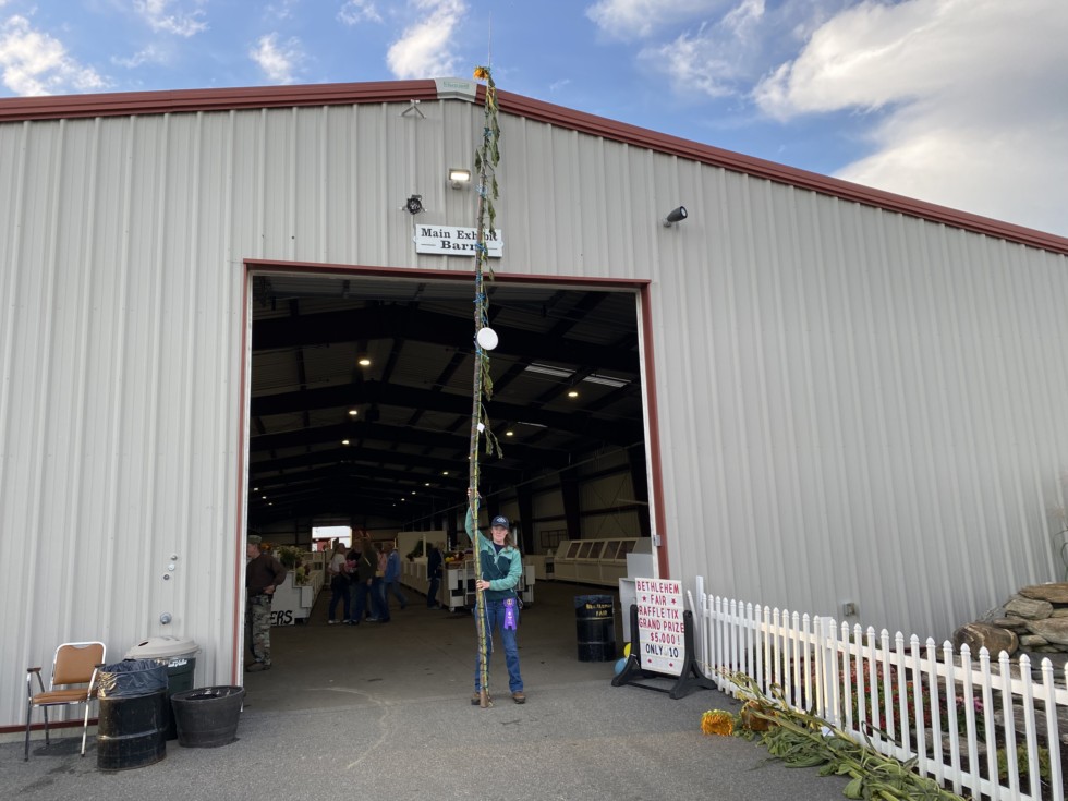 My daughter's 22' 4" tall sunflower. A new Bethlehem fair record! Growing these is alot of work. She had to tie it to a stake every couple of days for the whole season. A big Thank you to Richard mace who has helped my daughter over the years with seeds and advice.