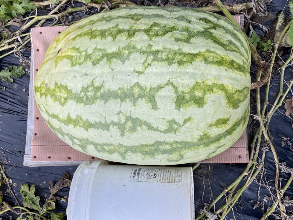 273 Williams Carolina cross. Looks like it's starting to go downhill. Too bad I think it was my biggest this year. Maybe over 200 pounds. It is one of the fattest melons I have grown. Two years in a row my biggest melons went down on me. I will have to make a few changes next year. This year would have been a good year to grow a good one. Lots and lots of sunshine!!