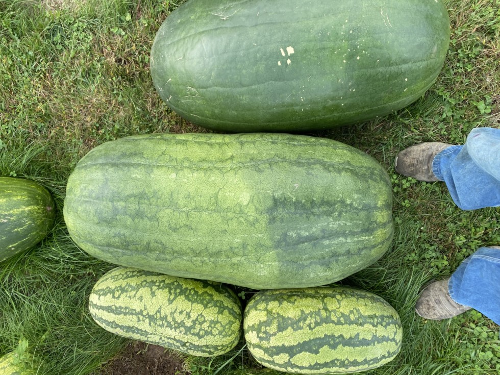These were the two melons I brought to the Durham fair. They are Tom Watson crosses. They are pictured next to 2 30 pound jubilee melons