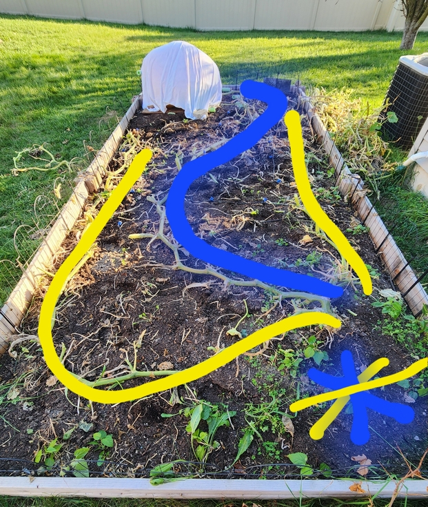 I defoliated the pumpkin vines and removed everything but the main and two secondaries. The vines in this 150sf patch were crossed over each other extensively. There were 3rd and fourth level vines forming a patchwork in the bed. Next year I will try to do a better job of removing dead and declining leaves.