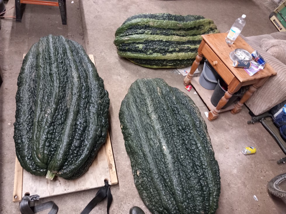 The three sound marrows are residing in the shed untill the end of the month. Although no WR this year I'm very happy with this season. I'll never know for sure as they were never weighed but I started off with 16 plants, lost one to mosaic virus early on, one was a runt at about 150 lbs and the other 14 were all in excess of 220 lbs. Next year I will have to cut down a little as I may not have so much time but the good news is my son Jack will be growing in the patches I won't be. To be continued......