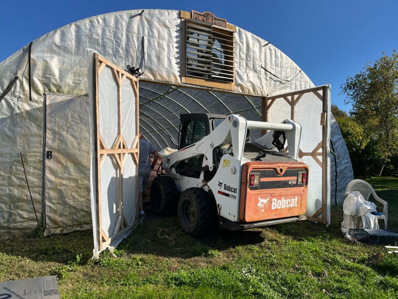 With the pumpkin on the pallet, the skid steer comes from the other side to pull it out.
