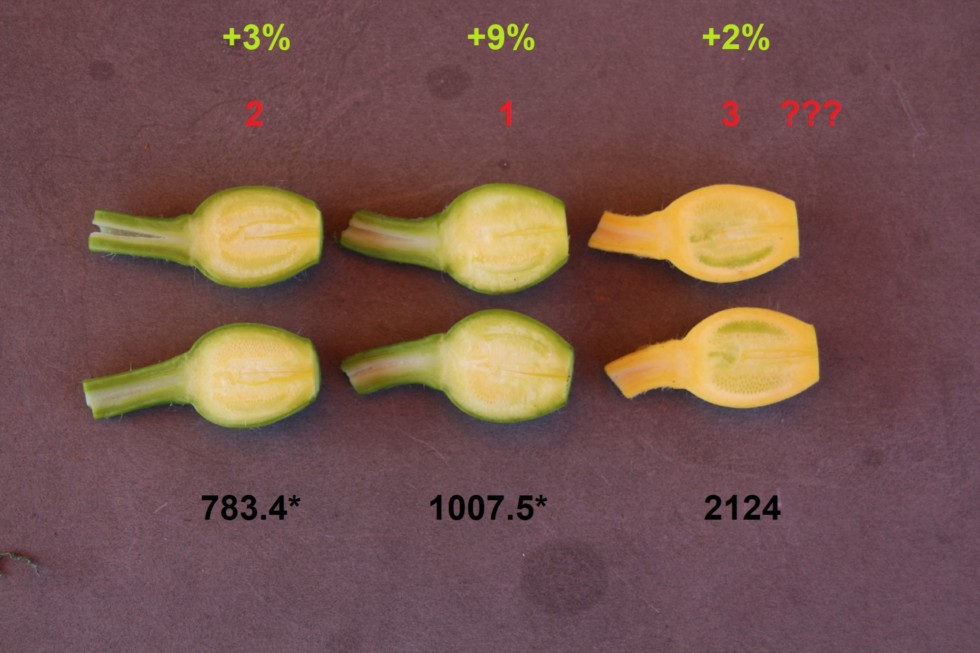 So, now, as we got this year's official results, I get back to the prediction I made on June 22nd...where I predicted the order of +/-% of the fruit of three of the plants depending on the wall thickness of the females. Here we go: The 1007.5* plant produced the 9% heavy 852.7 Wagler 25 ("Beasty"), my kids' 783.4* plant produced the 3% heavy 808.9 Wagler 25, and the 2124 plant produced my 2% heavy "Beaut" 990.8 Wagler 25. So, my prediction was fine, and I was glad that the 2124 plant's fruit went heavy at all. :)