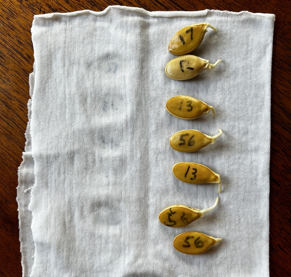 Pumpkin Pop - After soaking and bagging the chosen ones, I stuck them on top of my computer underneath my cable modem. 26 hours later, 100% germination! Number Key: 17 = 1765 Young; R = Ruby; 13 = 1366; 56 = 566. Look at the legs on the two 566's. They were trying to sink roots into my computer case...