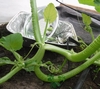 Here is a different view of the pumpkin, fan and sonicator set-up. The main vine has a slight bend to it, but a few nodes down is the back-up so this bend should be sufficient to keep it away from the pumpkin. Also, since everything is on the double layer of mill fabric adjustments will hopefully be easy to make as the season progresses if necessary.