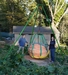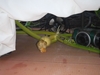 This shows the plant and set-up from a wider angle. Under the chair with the white sheet is the pumpkin with the small desk fan and sonicator to discourage mice and chipmunks from the area. Then there are two layers of mill fabric, �" plywood followed by two more layers of mill fabric. The reason for the double layer times two is to help make early adjustments easier by one person. Ideally the pumpkin is place in the perfect position, but rarely does this perfect positioning hold as the pumpkin grows. So, these help the pumpkin move with the least amount of physical force possible.