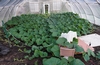Here the end that is lifted can be seen in better detail. The actual plant may seem a bit foggy, and this is because there is insect netting behind the plastic so when it is lifted there is still a physical screen in place. This allows air to come in, but limits the chance that unwanted insects can enter. To help this air flow process a blue "Henry" (Carpet) Fan can be seen. This will help direct outside air into the hoop house and under the leaf canopy.