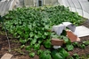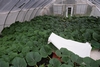 What you will notice is a painted white piece of plywood behind the pumpkin set-up. This matches the plywood that is between the layers of mill fabric as the white paint helps reduce some of the moisture absorption. However, there is no mill fabric underneath or on top of this piece. The reason for this is to provide easy grower access with a reduce chance of slipping as two pieces of mill fabric can be very low friction.