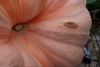 Even though this is already a damaged pumpkin, to stay in the same routine, the bottom is still inspected to the same level of scrutiny as all the other pumpkins are. The bottom is flat and for this portion of the pumpkin it would pass inspection. However, all it takes is one spot anywhere on the pumpkin, and the "Fish Egg" / "Edema" area about the diameter of a half-dollar is what cause this pumpkin to be classified as damaged. Other than that one odd spot, the rest of the pumpkin was flawless.