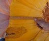 The bottom floor of the pumpkin there is a rule stood up vertically that is 12" in total length, which shows the thickness of the pumpkin rind at about 11". Overall, a thick pumpkin with no areas of concern in regards to structural integrity as seen in this cross section.