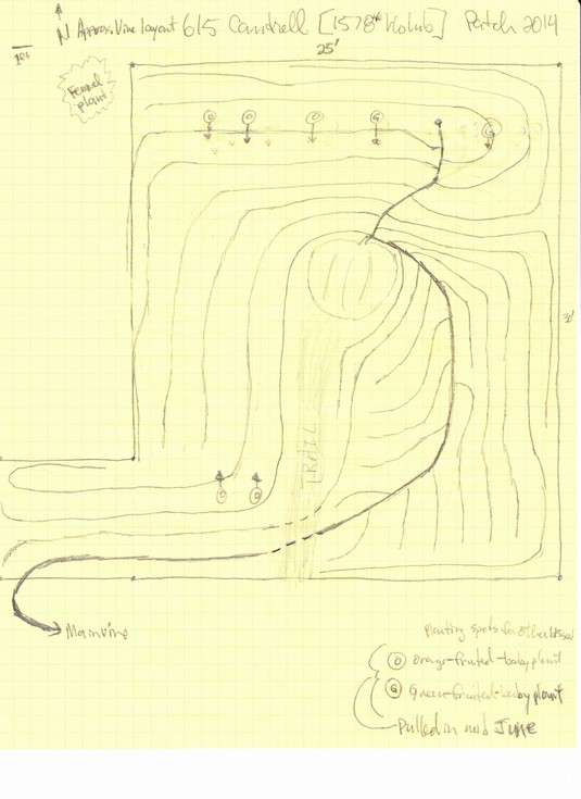 Approximate hand-drawn vine diagram for the 1578* Holub. Also shows where the other 615 Cantrell seedlings were planted in the patch (the circled (o)-orange/yellow and (g)-green for the female baby fruit color. All but the keeper were pulled in early-mid June.