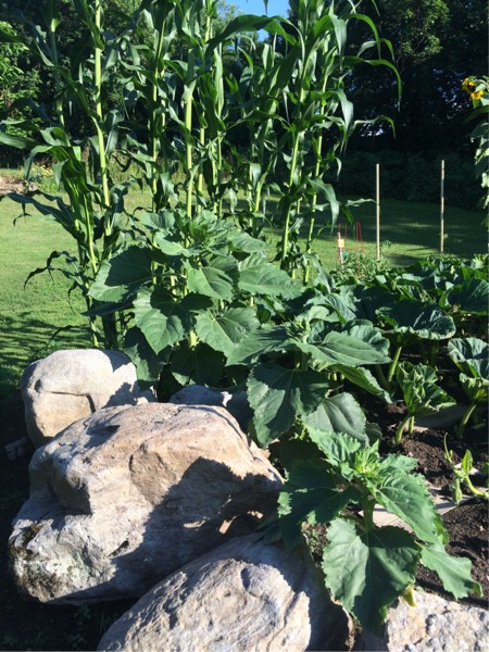 These are the short "big head "sunflowers we got in the seed exchange ... Notice how they are growing shortest to tallest as to make a good photo ...I willed that to happen...too bad they'll face the corn when they flower....dang