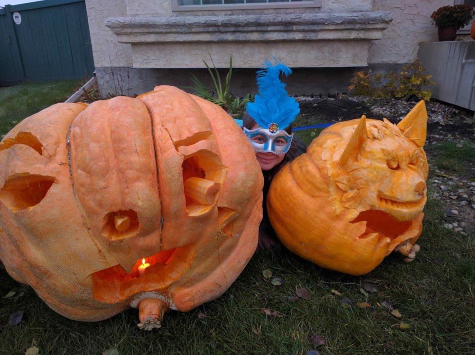 The final creations - still the biggest jack-o-lanterns in the neighborhood but a lot smaller than in past years.