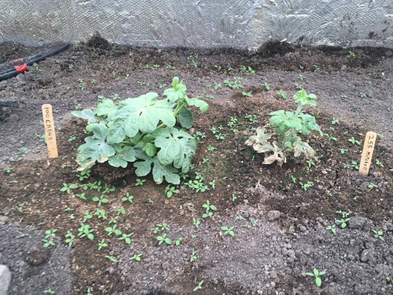 100 Crews watermelon is vining out. 255 Mitchell is recovering. Going to have to make a decision soon. Want the 255 but it's small compared to the 100. Ignore the weeds. Their days are numbered.