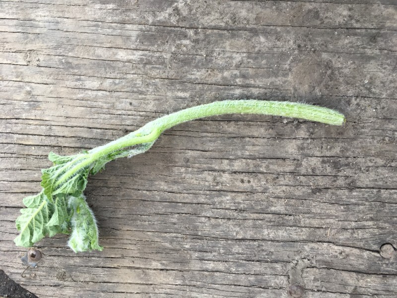 Here's the main vine of the watermelon. It outgrew the shack and bent up at the end. It was really growing fast too. This grafting thing is like strapping a rocket to your back. Sure will be fast and fun for a few moments then ...