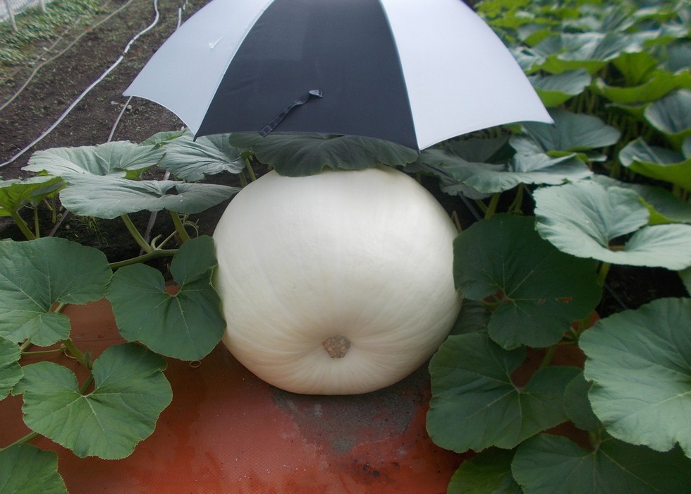 Growing two of the same seed this year has provided a unique comparison. This plant was a back-up to my original plan, but due to its aggressive growth early on it made the final selection. The plant behavior is very similar to its sibling, but the pumpkin has a very different color. The shape is almost a perfect ball and the color at the moment is a faint creamy white. I really like how this pumpkin looks as it has the characteristics of a fruit that can go the distance. Time will tell if this ends up being the case.