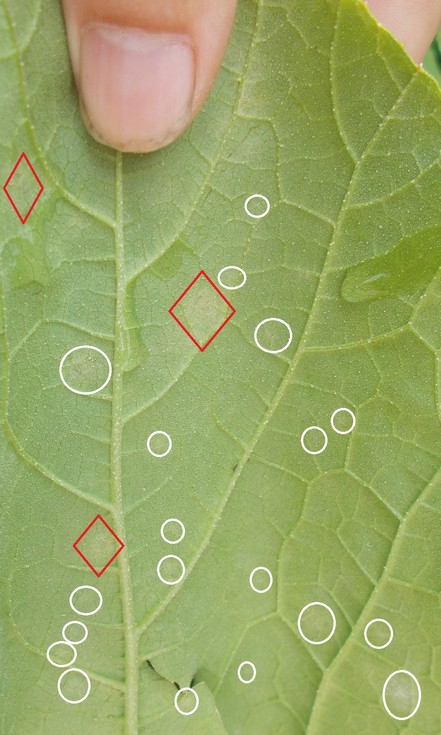 Here are the points of interest highlighted for you. The white circles represent Powdery Mildew and the red diamond is Angular Leaf Spot, even though Downy Mildew would have the same visual appearance.
