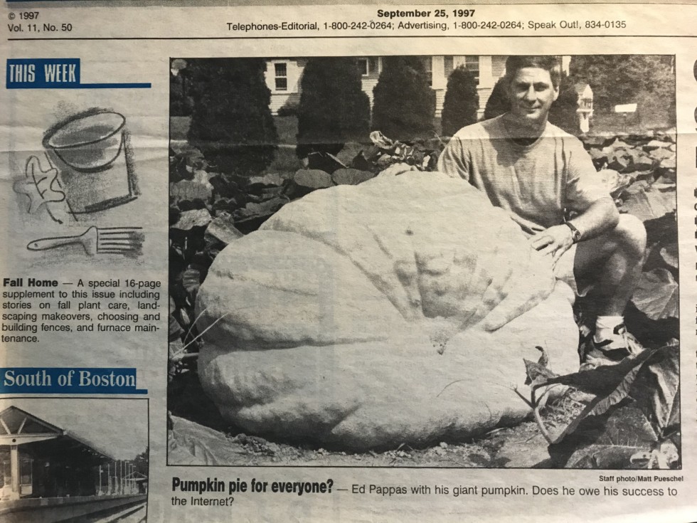 A Throwback Thursday Pic from 1997. My fifteen minutes of fame on the front page of our local newspaper. This was my second year of growing. The pumpkin came in at 585 pounds which was pretty good back then.